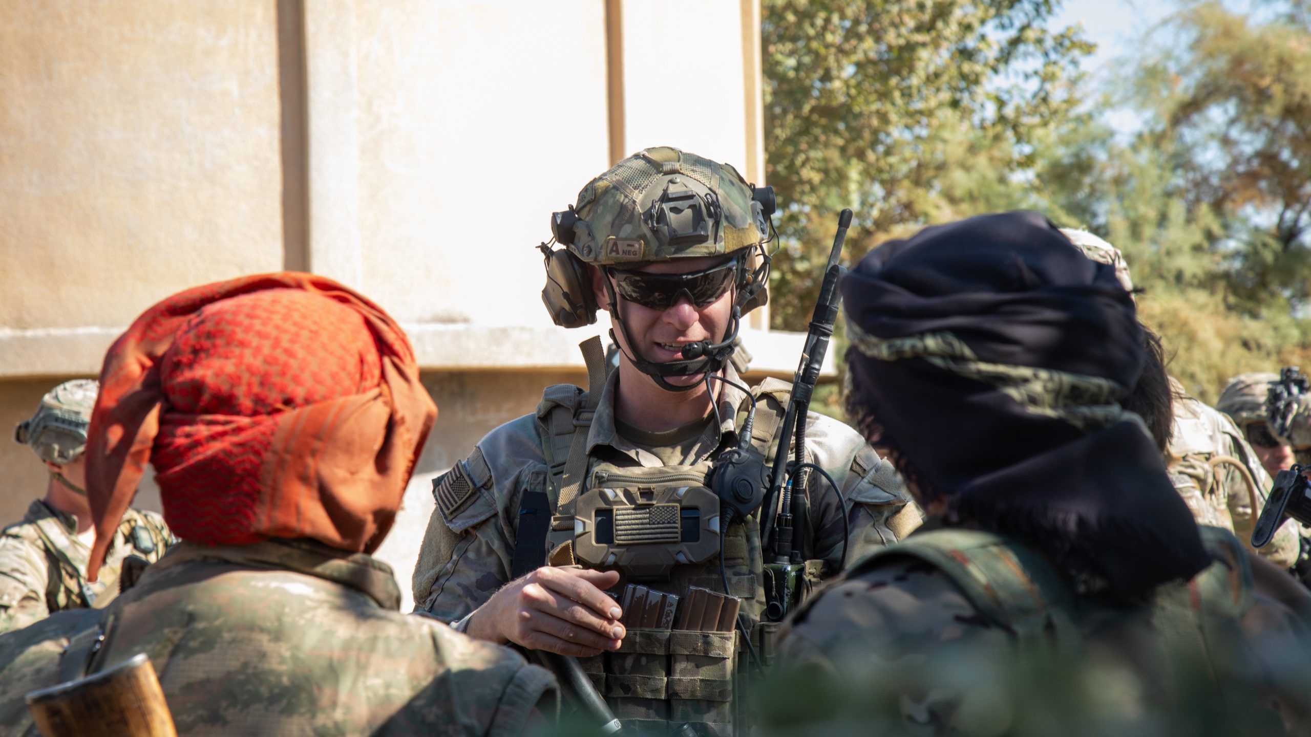 Artikkelikuva: Yhdysvaltain armeijan sotilas kuuntelee SDF:n jäseniä Koillis-Syyriassa 2024. Kuva: U.S. Army, Sgt. Jamie Robinson.