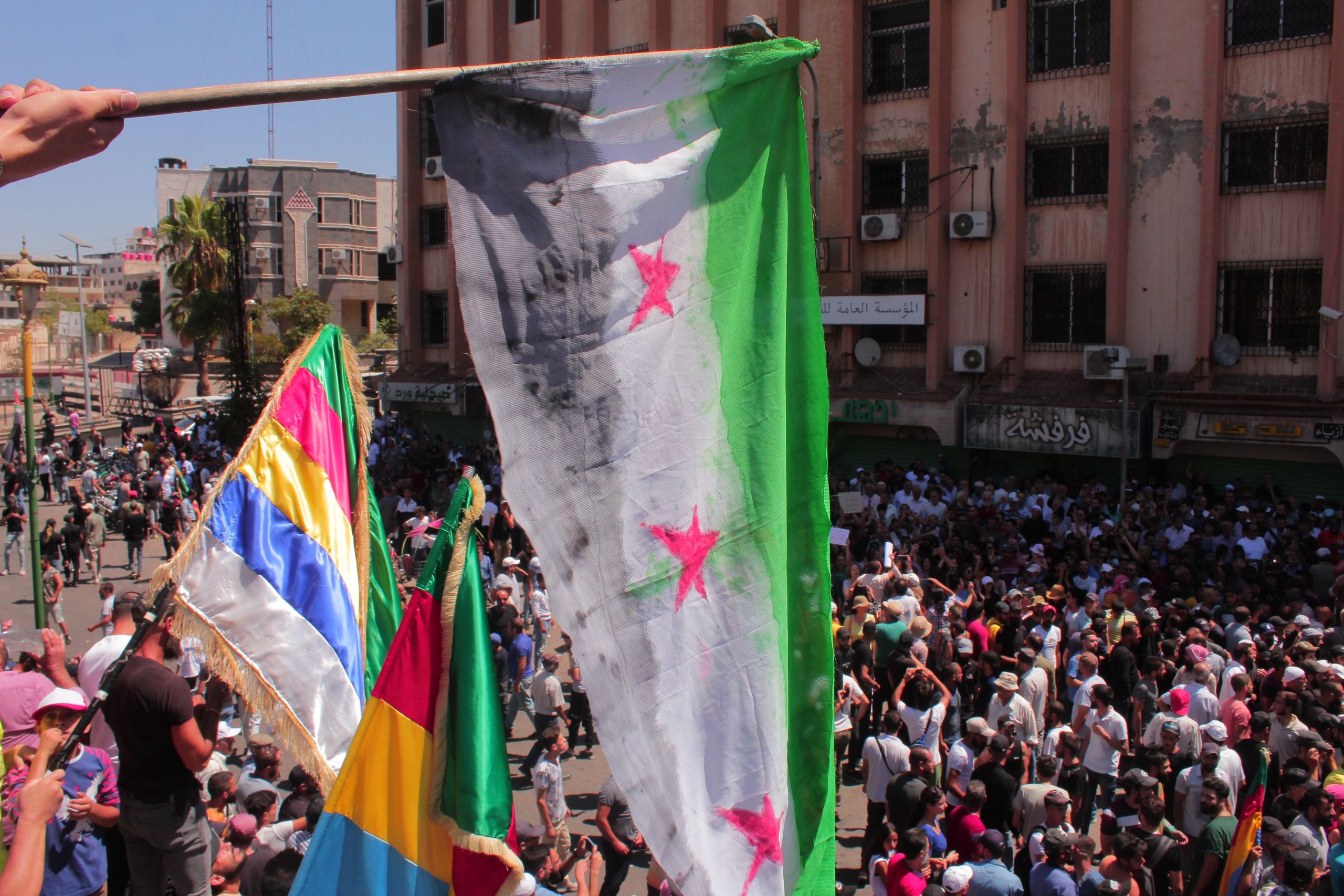 Artikkelikuva: Mielenosoitus Assadin hallintoa vastaan Sweidassa elokuussa 2023. Etualalla Syyrian ja druusien liput. Kuva: Fahed Saad Kiwan.