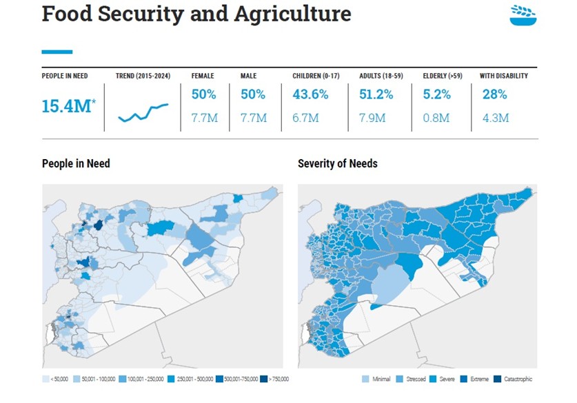 According to the UN Office for the Coordination of Humanitarian Affairs (OCHA), a staggering 16.5 million Syrians need humanitarian aid. Of these, 7.4 million are internally displaced persons (IDPs). More than 90% of people in Syria live below the poverty line, and over 60% need humanitarian aid to survive. The economy is in crisis: the Syrian pound has collapsed from about 50 pounds per dollar in 2011 to about 16,000 pounds per dollar by late 2024. The monthly salary of a state employee barely covers a few days’ worth of food.