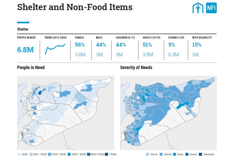 Shelter and housing: The war systematically destroyed housing, even entire villages. Millions of internally displaced people have no homes to return to. It is estimated that 7 million people need shelter assistance. In northern Syria, 2.4 million still live in tents. The 2023 earthquake further worsened the situation.