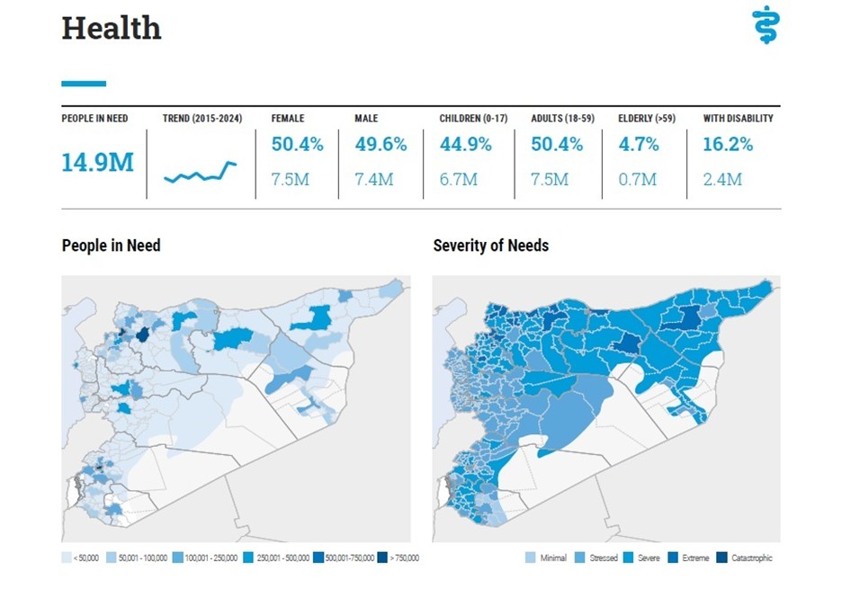 Health: Health care has collapsed. Hospitals and clinics were bombed, staff fled, and essential equipment is lacking. It is estimated that 14.9 million people need health care.